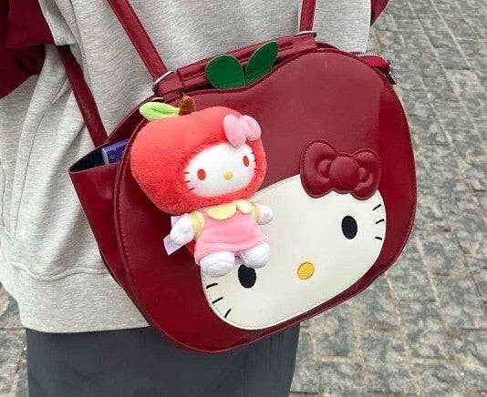やったー!一番欲しかったリンゴkitty柄のバッグが当たった🍎✨ラッキーすぎる!リュックとぴったり合う!